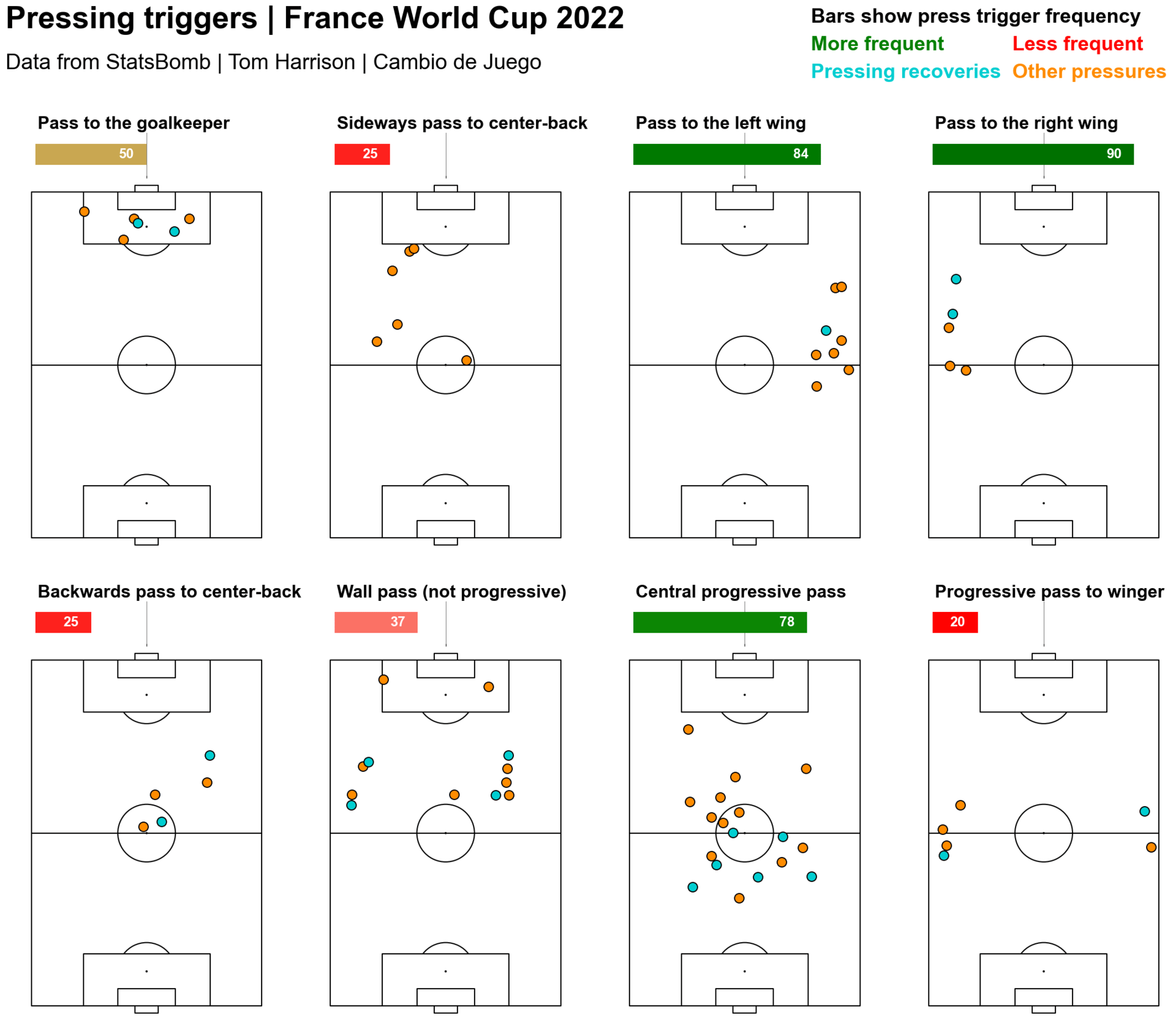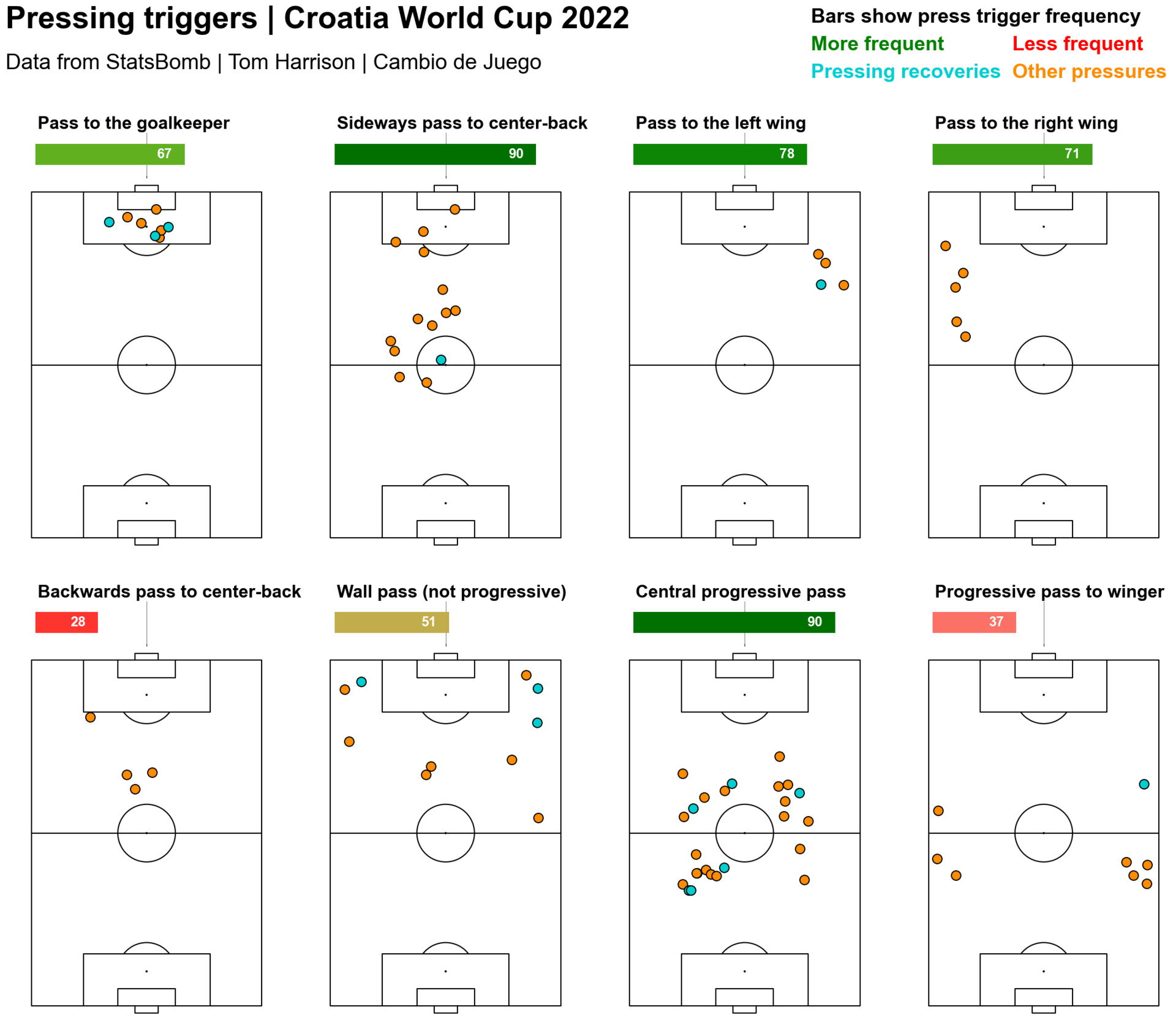 Here are some visualization examples from the 2022 World Cup. The bars show how frequently the team used this pressing trigger vs other sides in the competition (normalised for opportunity). Green = More pressures. Red = Fewer pressures.